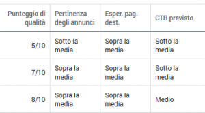 Google esprime il suo giudizio con un punteggio che va da 1 a 10 per ciascuna delle parole chiave che attivano l’annuncio.