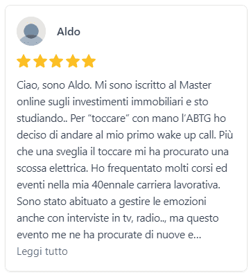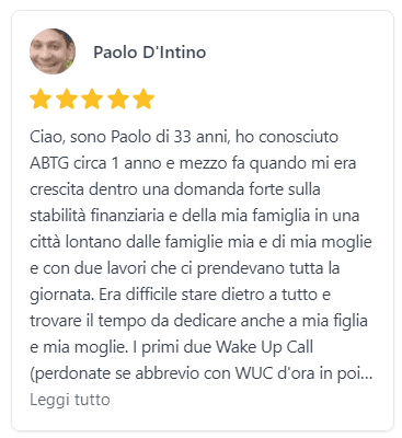 Wake Up call è un intenso corso della durata di tre giorni che ti spiega concretamente quali sono le tecniche per costruire la tua Libertà Finanziaria. Il programma del corso contiene una parte sulla psicologia del denaro e una parte sulle tecniche che funzionano e che sono replicabili in Italia e all’estero per ottenere entrate automatiche. Lo scopo del corso non è renderti operativo da subito, ma permetterti di tornare a casa con le idee chiare su cosa devi fare per costruire la tua Libertà Finanziaria.